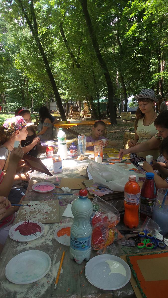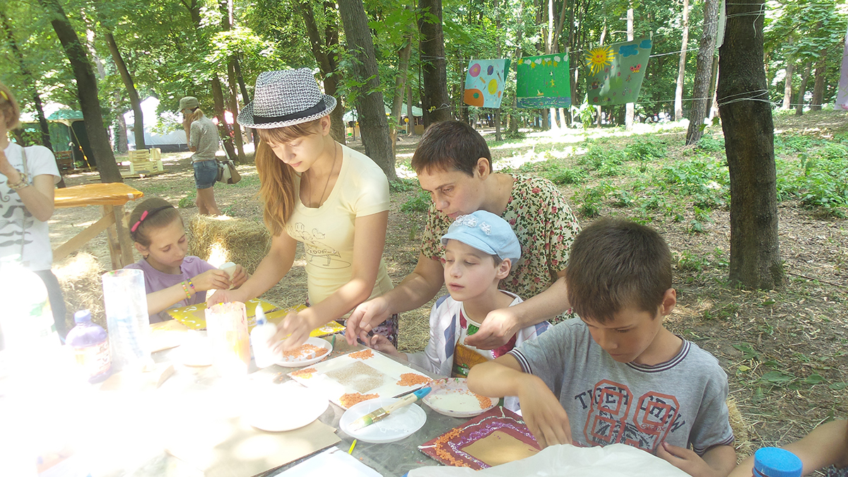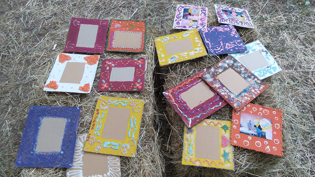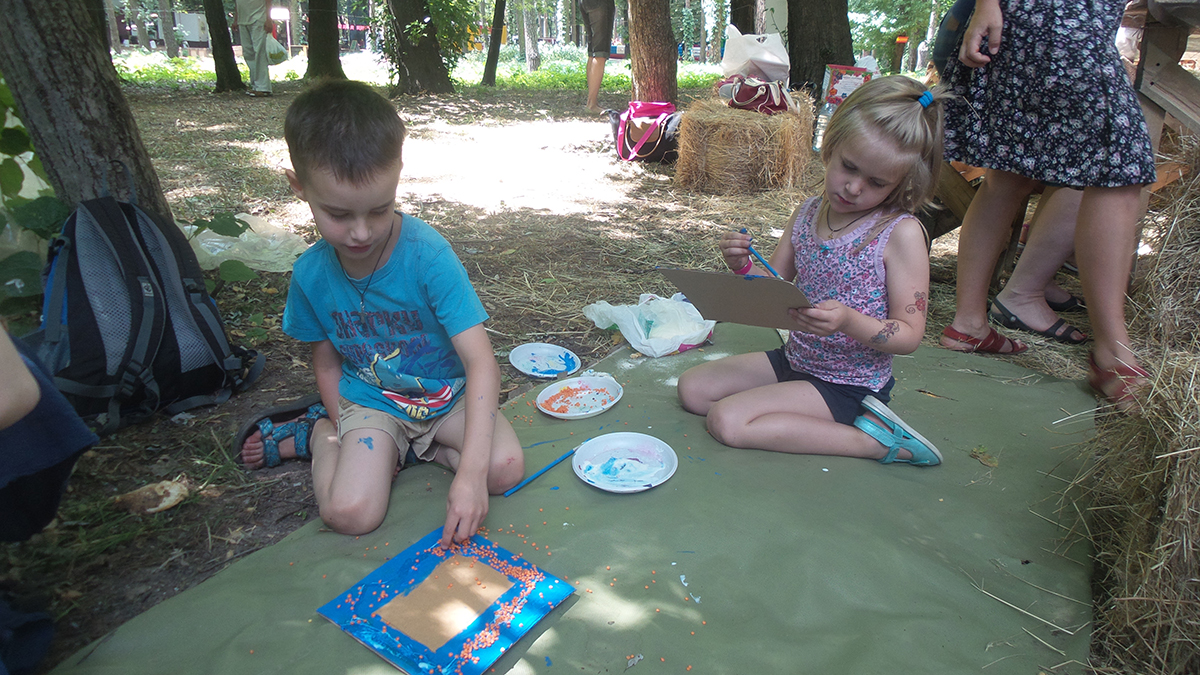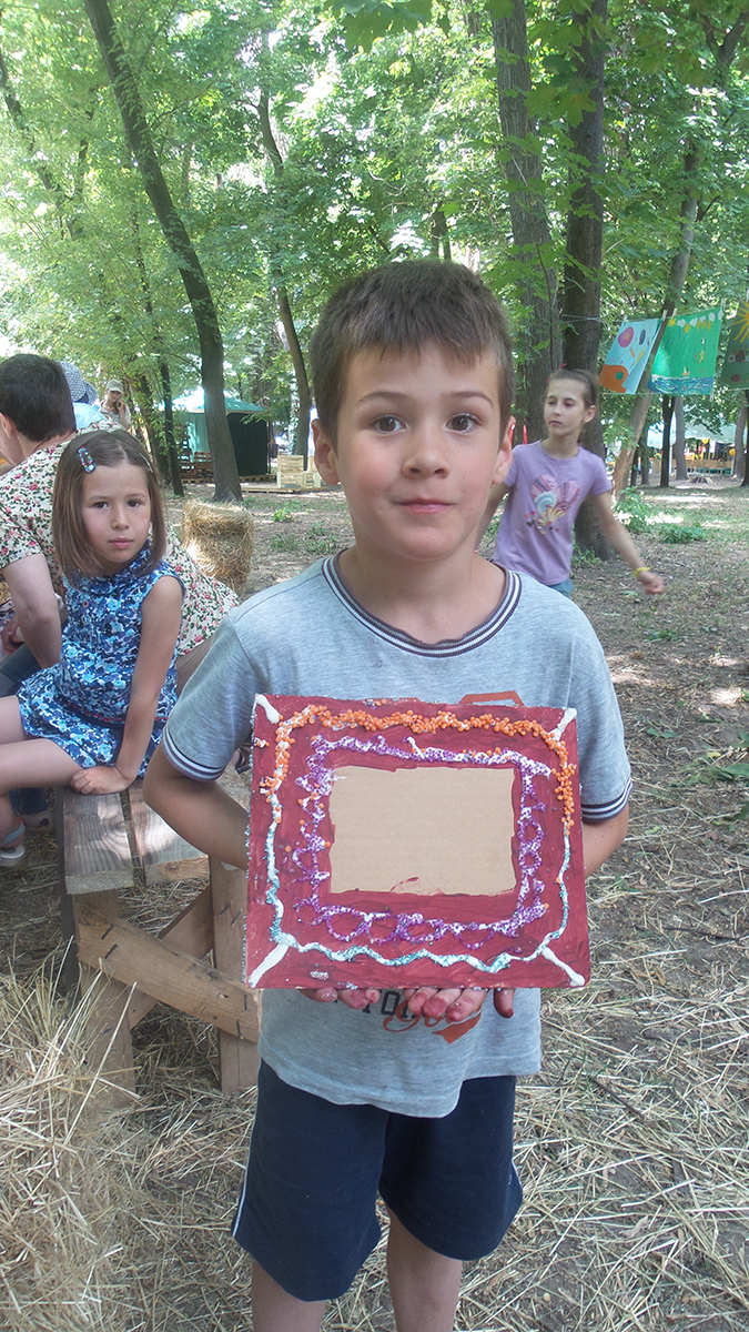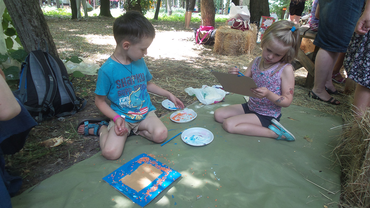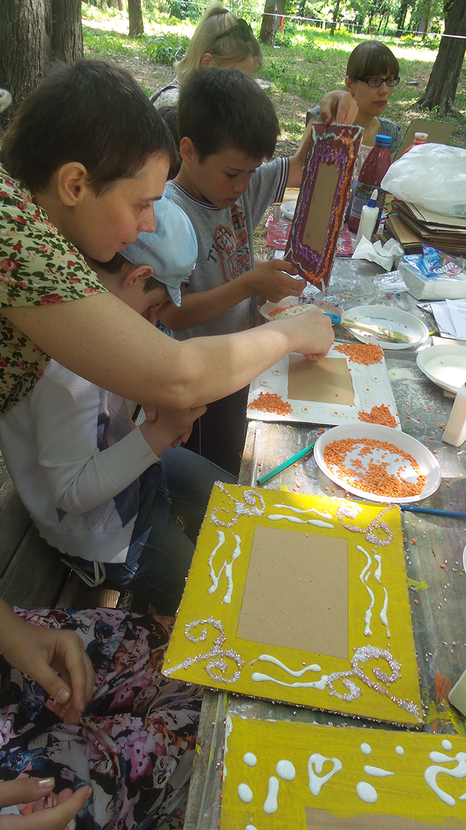 Створювали з дітьми та дорослими рамочки для фото в подарунок діткам з онкологічного відділення ОХМАТДИТа. Завдяки ГО “Здорове людство” в рамках Добрих справ арт-пікніка Слави Фролової, я провела майстер клас з дітьми та дорослими. Такого ажіотажу я не очікувала 🙂 Було багато бажаючих прийняти участь – ми всіх прийняли, посадили навіть на мат – так було ще цікавіше 🙂 І результат вийшов відмінний: діти з величезним задоволенням створювали рамочки з різних матеріалів, малюки грали з крупами та бісером і створювали абстрактні візерунки, дорослі і доросліші діти створювали складні візерунки і вивчали комбінування кольорів. Декілька фото для малюків ми одразу оформили в рамку і підготували для подарунку діткам.